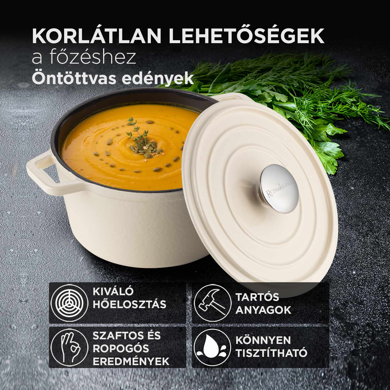 - A főzőedény rendkívül tartós, egyenletesen melegszik és egyenletesen tartja a hőmérsékletet.