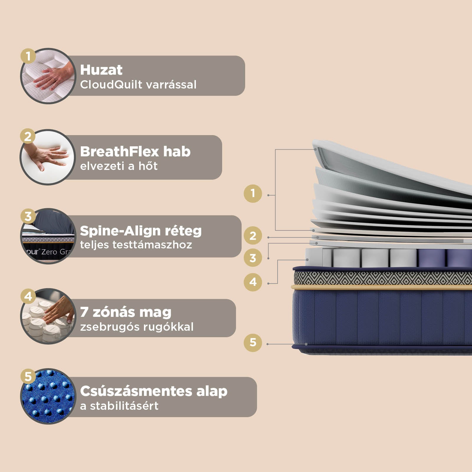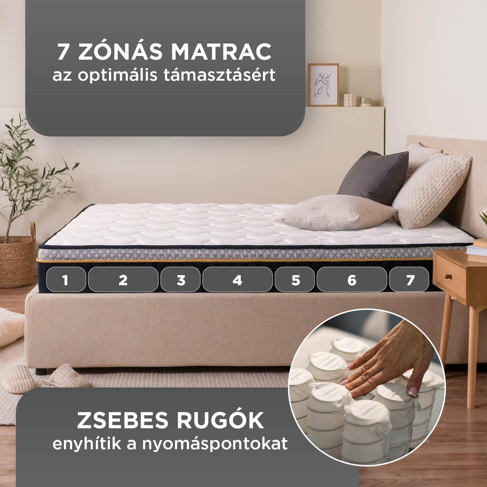 - A 7 zónás hibrid matrac tökéletes, célzott alátámasztást biztosít a test minden részének.