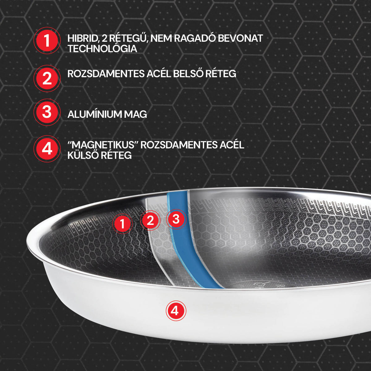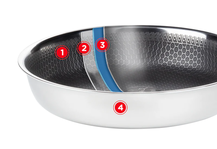 - A hibrid anyagkombináció – rozsdamentes acél, alumínium és tapadásmentes bevonat – gyors és egyenletes hőelosztást, maximális erőt és karcállóságot biztosít.