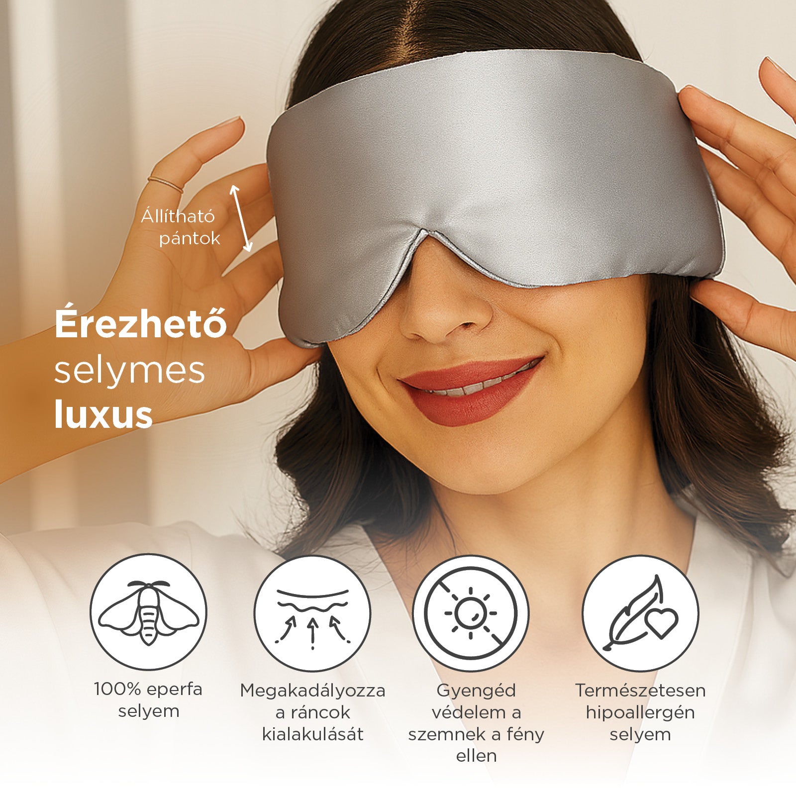 • „A bőrgyógyászom ajánlotta a selyemmaszkot, és egy hét után a különbség valóban észrevehető. Reggelre a bőröm kipihentebb, nincs rajta lenyomat vagy ránc.” – Molly