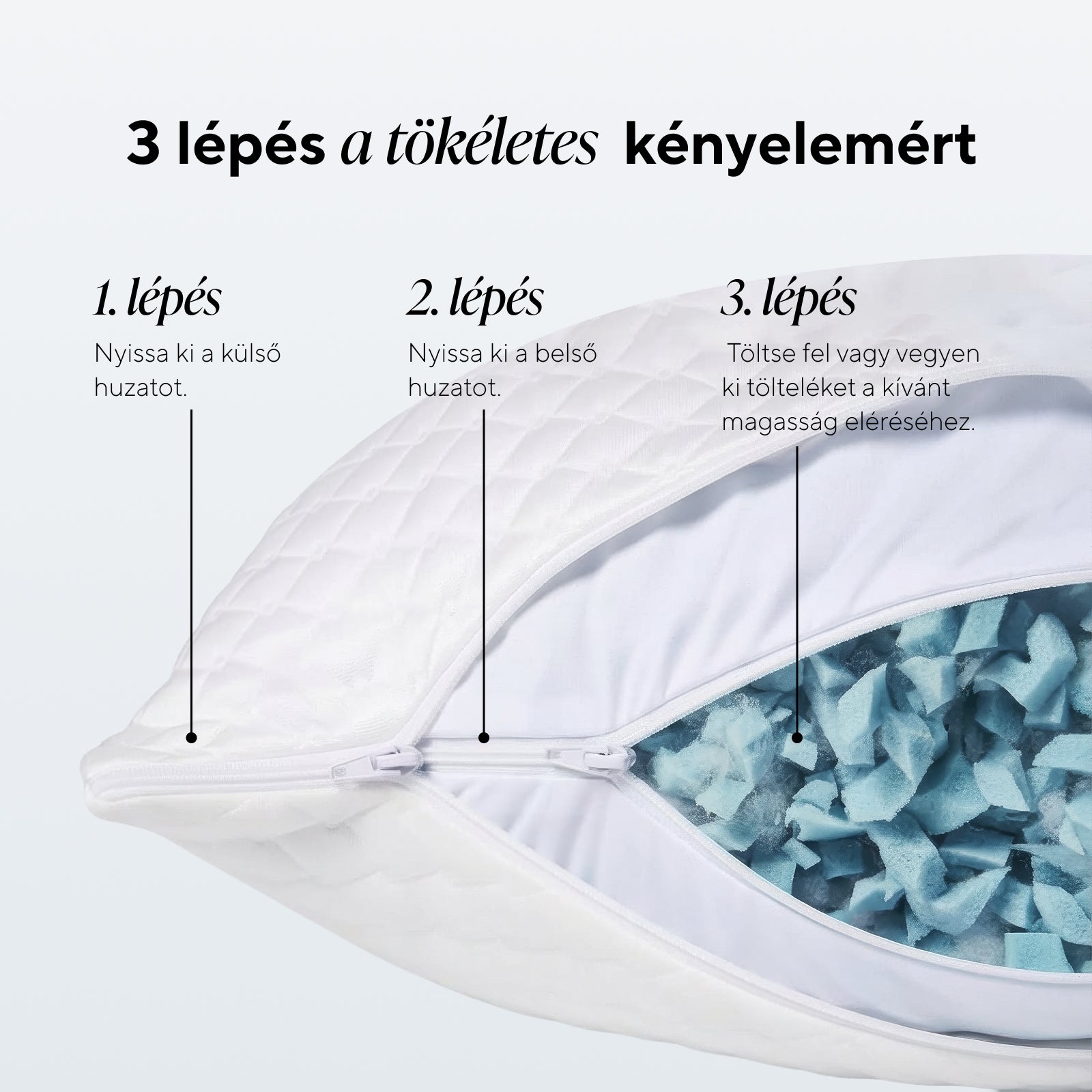 Használja a teljes töltetet a magasabb és keményebb párnához – ideális azok számára, akik háton alszanak. Csökkentse a töltet mennyiségét egy alacsonyabb párnához, amely kényelmes oldalt vagy hason alvást tesz lehetővé.