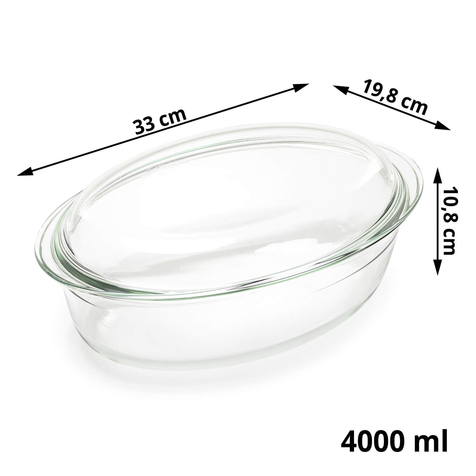 - Ovális üveg tepsi fedéllel, 4000 ml űrtartalommal.