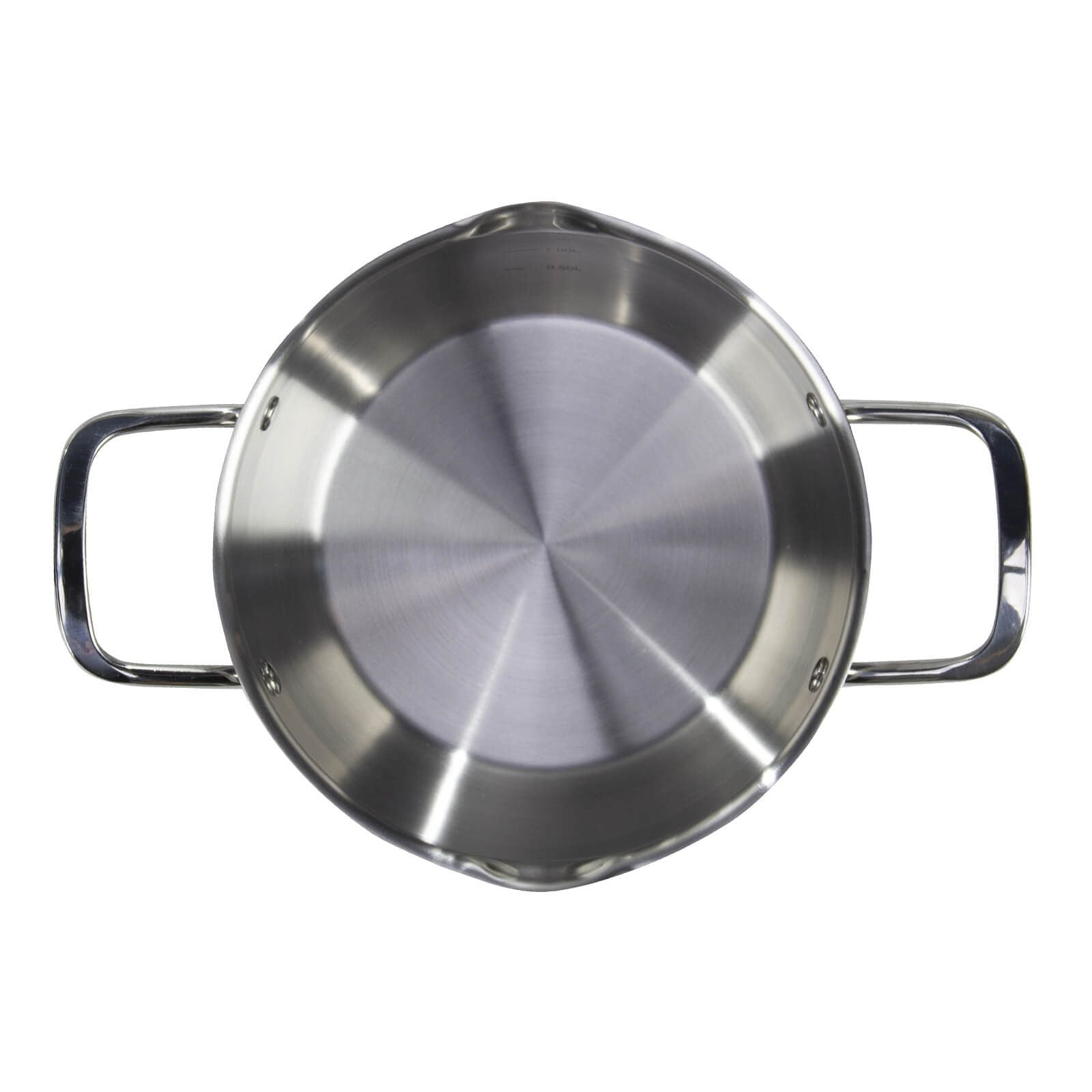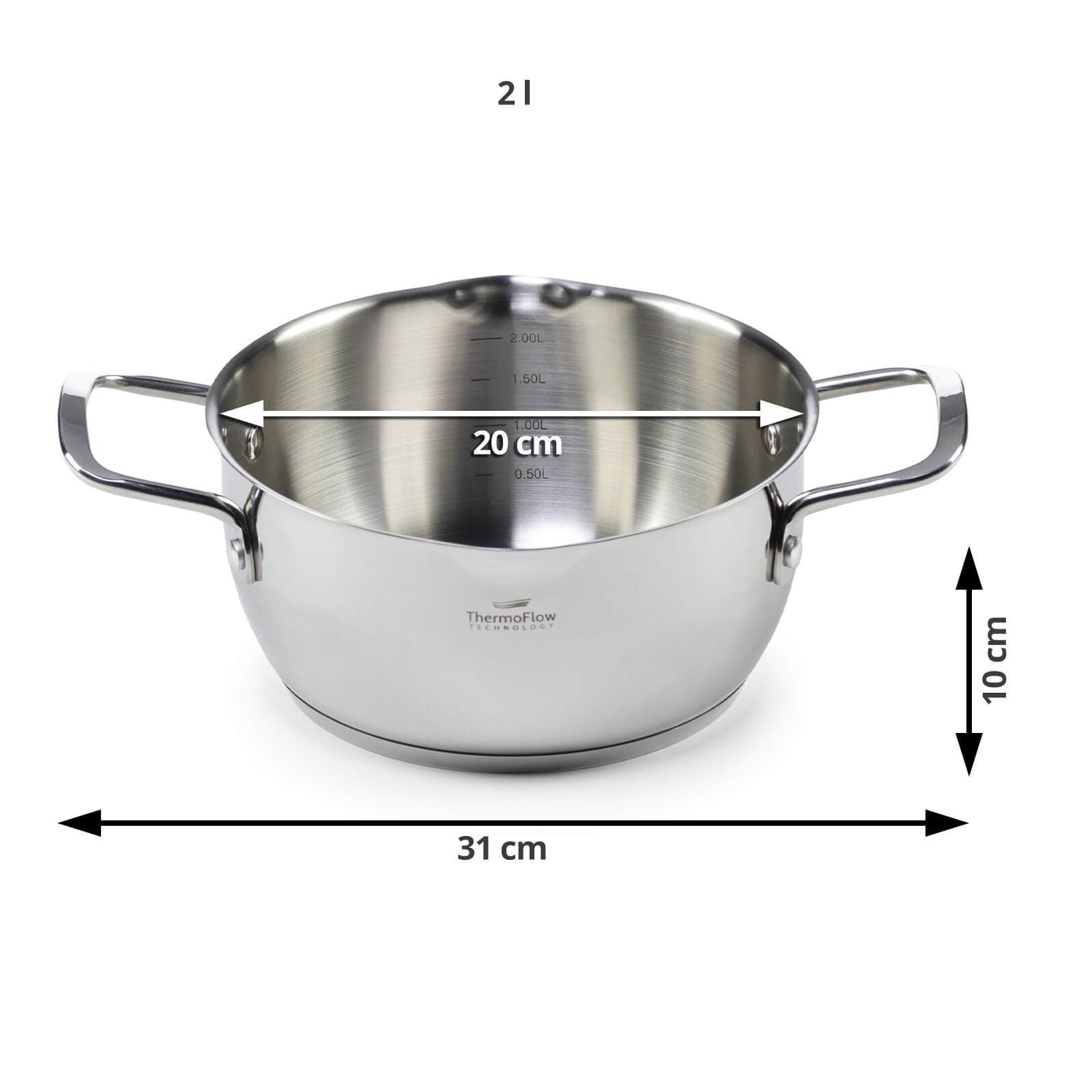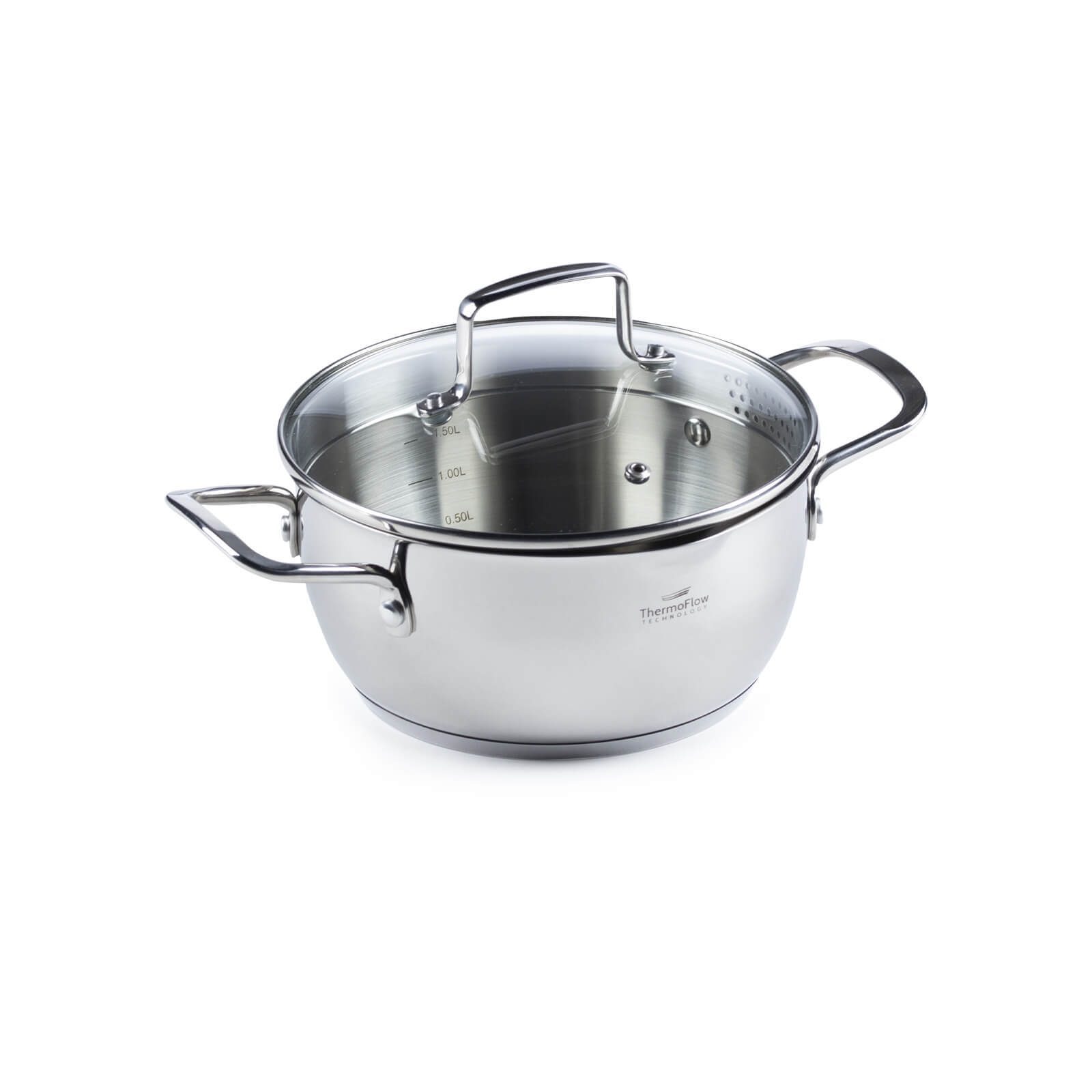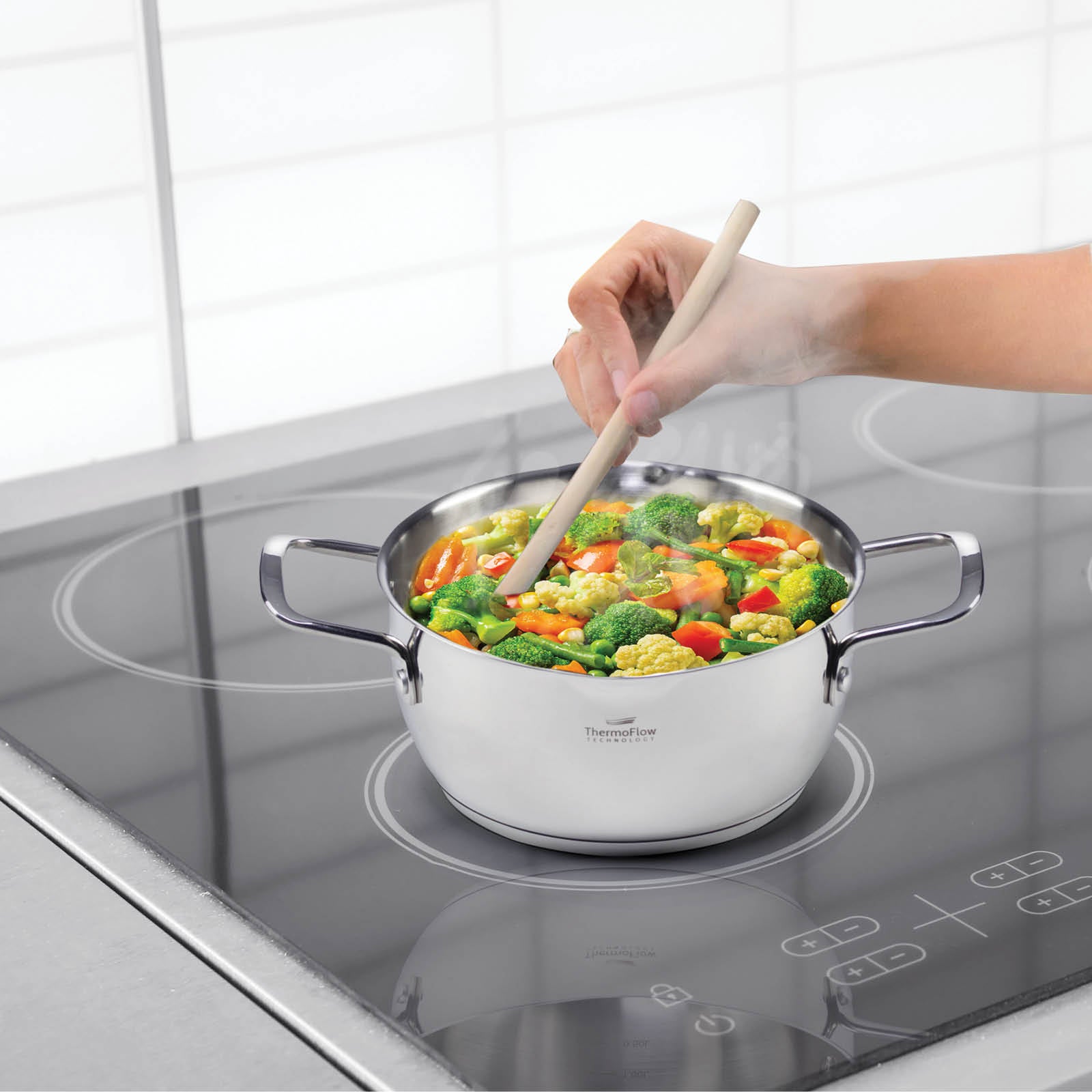 Kiváló minőségű 18/10 rozsdamentes acélból készült főzőedény 3 rétegű ütköző aljjal a gyors felmelegedés és egyenletes főzés érdekében. A vastag réteg prémium német minőségű rozsdamentes acél, a jó hővezető képességet biztosító alumínium mag és a rozsdamentes acél külső biztosítja a tartósságot, az ellenállóságot és a hatékony főzést. A ThermoFlow technológia egyenletes hőeloszlást biztosít a főzőedény teljes felületén, így a főzőedény acélkerete megfelelően felmelegszik, és gyors és rendkívül hatékony főzést tesz lehetővé, anélkül.