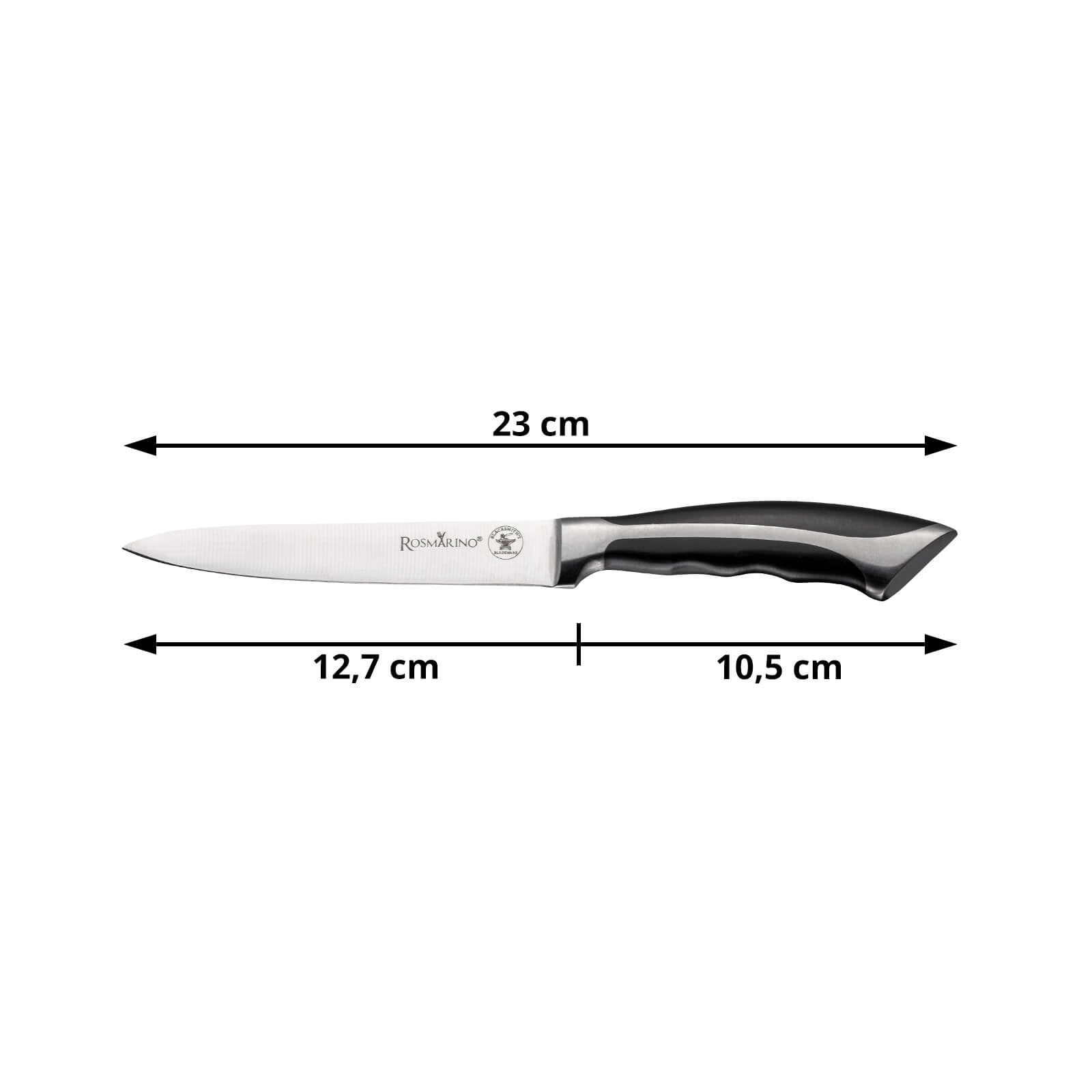 A Rosmarino Blacksmith's Utility tökéletes konyhakés minden profi szakács és kezdő számára! Ez a kisebb kés formájának köszönhetően ideális hámozásra, szeletelésre és aprításra. A penge német minőségű rozsdamentes acélból készült, a strapabíró nyél pedig kiváló minőségű fröccsöntött ABS műanyagból, amely maximális terhelést tesz lehetővé. A professzionális élesség segít Önnek gyorsan és pontosan felszeletelni az ételeket vékony szeletekre és kisebb darabokra. A kés előnye a kézzel, mindkét oldalon 15°-os szögben élezett penge, amely hosszan tartó élességet és tartósságot biztosít. A speciális élezésnek köszönhetően a kés ellenállóbb a korrózióval, rozsdával és foltokkal szemben. A kés egyszerűen tisztítható folyó víz alatt kevés mosogatószerrel.
