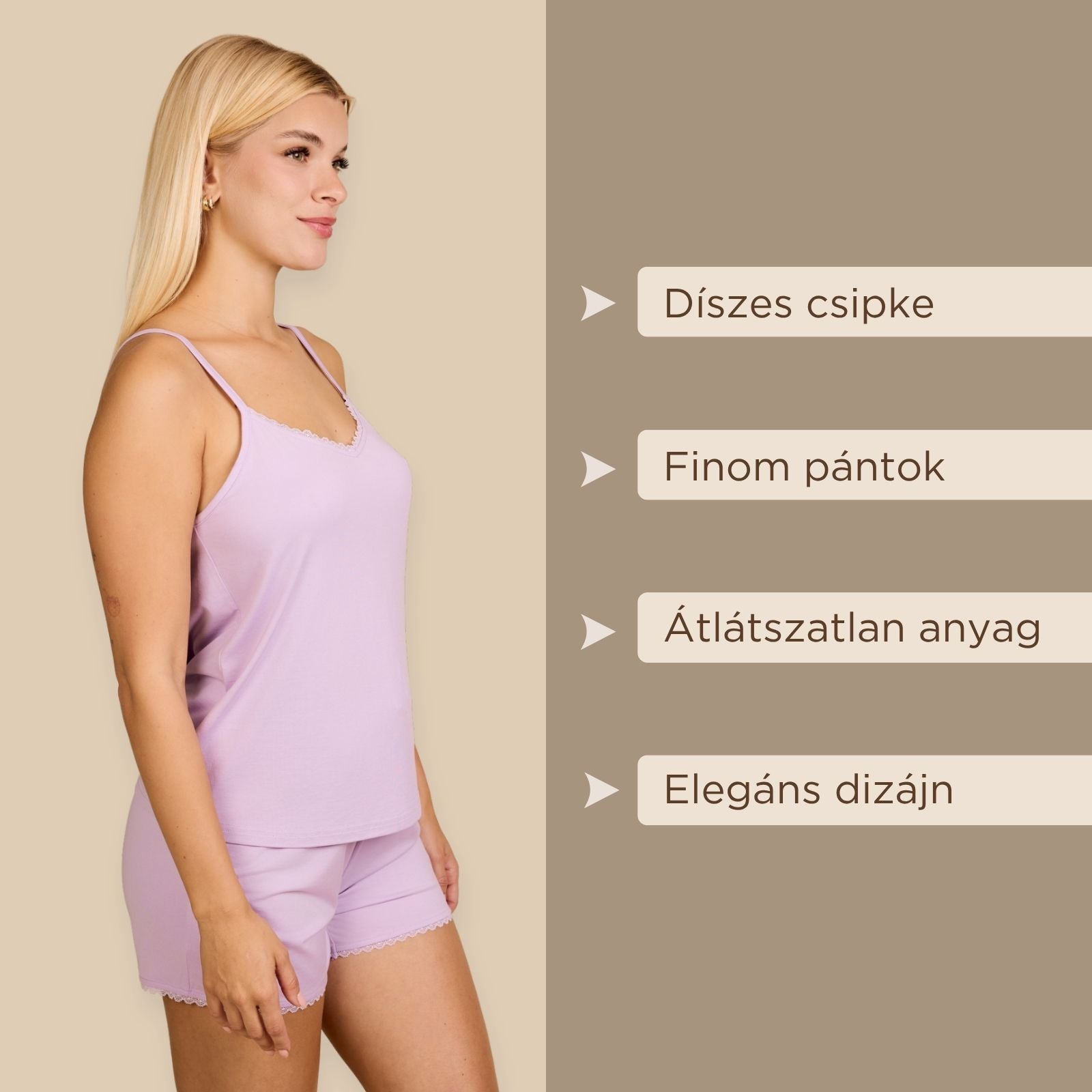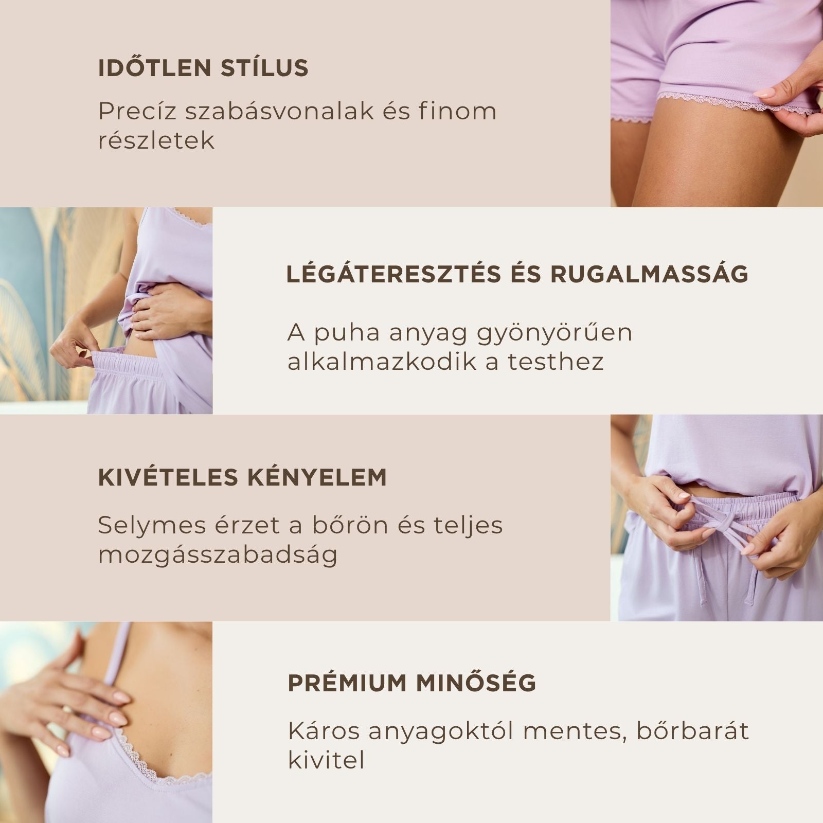 - Kényelmes rövidnadrág elasztikus derékkal és megkötővel – ideális pamut női pizsama rövid választás
